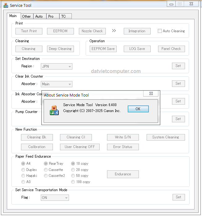 - Phần mềm Canon Service Tool V6400 ra mắt ngày 22/01/2025 và được thiết kế với giao diện đơn giản, dễ sử dụng nhưng chứa nhiều tính năng mạnh mẽ, giúp người dùng thực hiện nhanh các thao tác bảo trì Reset Waste Ink Counter (Xóa lỗi tràn bộ nhớ)