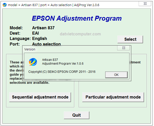 - The Epson Artisan 837 Adjustment Program is a powerful maintenance and service utility designed for the Epson Artisan 837 all-in-one inkjet printer. This specialized software allows users and technicians to perform professional-level diagnostics, maintenance, and counter resets that go beyond normal printer settings. If your Epson Artisan 837 has stopped printing and shows an error like “Service required” or “Ink pad is at the end of its service life,” then this tool is exactly what you need to restore your printer’s performance.