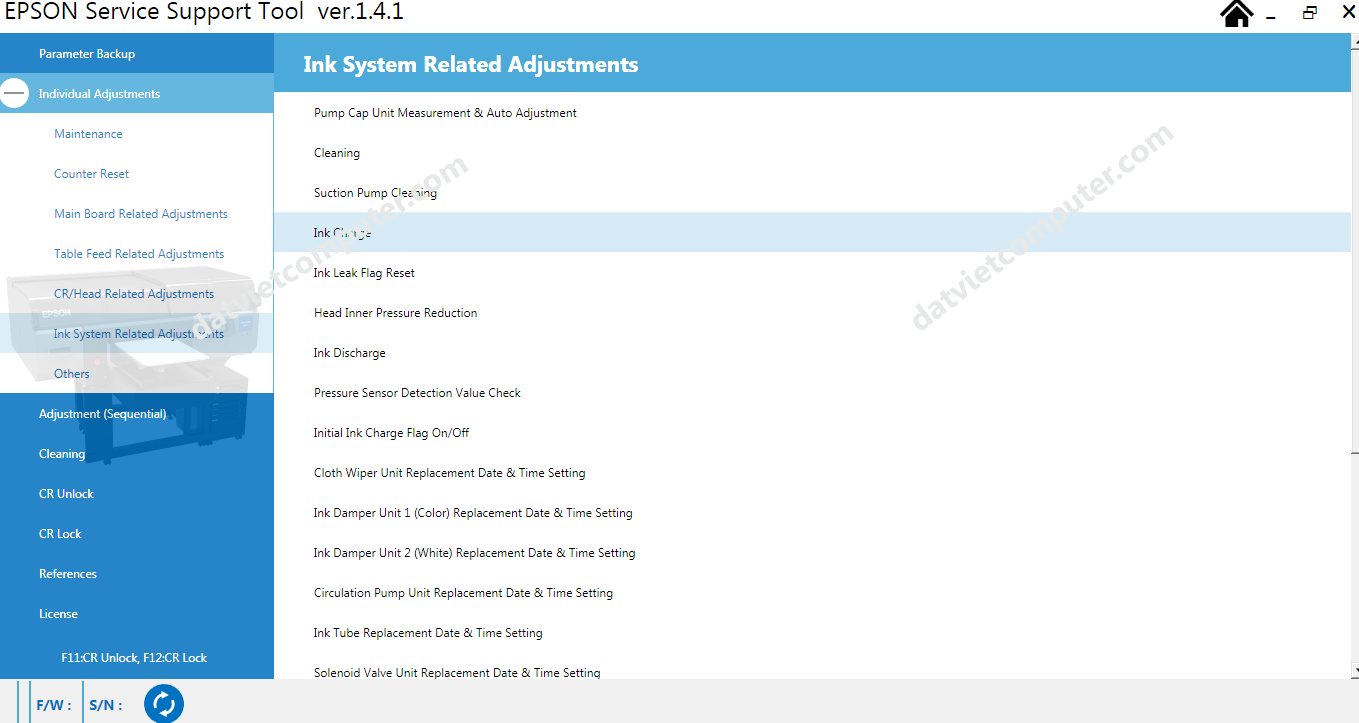Service Program Support Tool Epson SC-F3000 Series Adjustment là phần mềm chuyên dụng dành cho dòng máy in DTG (Direct To Garment) cao cấp của Epson như SC-F3000, F3030, F3050, F3060 và F3070. Đây là công cụ không thể thiếu dành cho kỹ thuật viên, doanh nghiệp in áo chuyên nghiệp, giúp thực hiện các thao tác bảo trì, reset bộ đếm, kiểm tra hệ thống và tối ưu hiệu suất máy in.