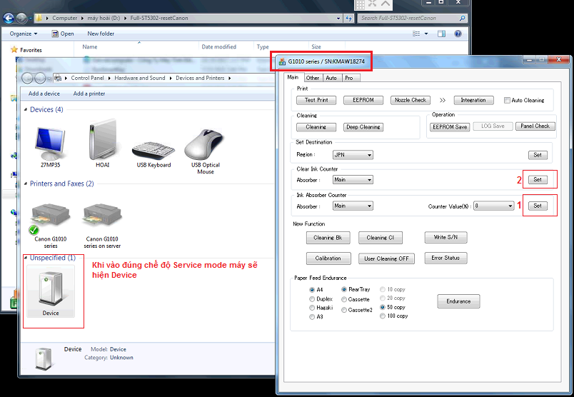 Phần mềm RESET Máy in Canon ST V5302 dễ dàng sử dụng và tự reset, bạn chỉ cần vào chế độ SERVICE MODE của máy in , tùy từng model máy mà chế độ service mode cũng khác nhau.
