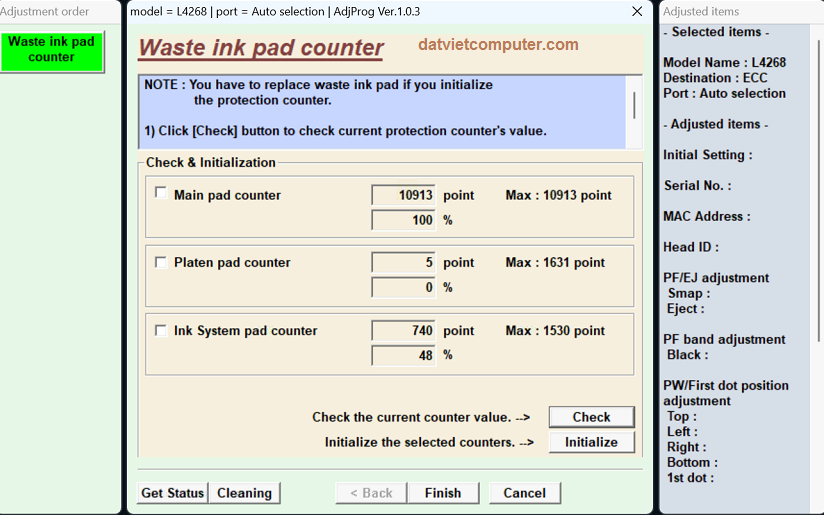 Sau đó, tích chọn Main Pad Counter và nhấn Initialization để reset bộ đếm.