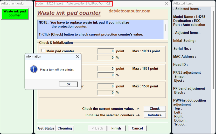 Adjustment Program hoặc Resetter WIC-RESET-COUNTER) là công cụ giúp khắc phục lỗi máy in, thường gặp nhất là lỗi “ink pad is at the end of its service life”. Lỗi này xuất hiện khi bộ đếm (counter) trong máy in đạt đến giới hạn số lần in được thiết lập sẵn bởi nhà sản xuất. Khi đó, máy in sẽ bị khóa và không thể tiếp tục hoạt động.