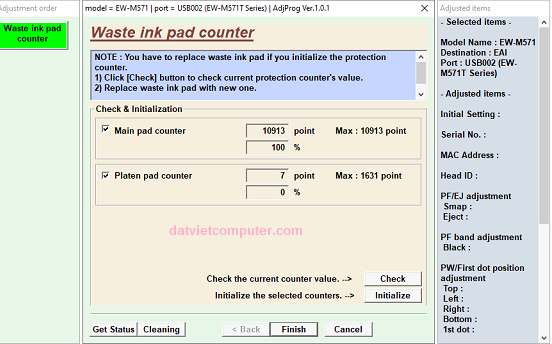 Kết nối máy in với máy tính qua cáp USB. Mở phần mềm, chọn model EW-M571T và cổng kết nối. Chọn Particular Adjustment Mode > Waste Ink Pad Counter. Tích vào Main Pad Counter và Platen Pad Counter, sau đó nhấn Initialize để reset bộ đếm.